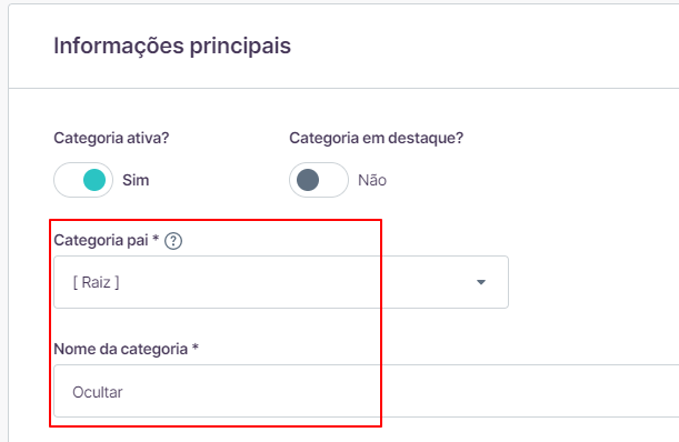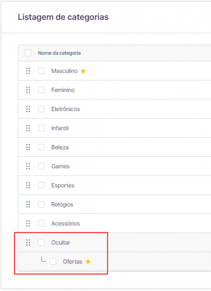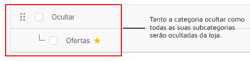 Você pode ocultar totalmente qualquer categoria da sua loja. A categoria ocultada não irá aparecer, porém continuará acessível se você enviar o link dela. Essa funcionalidade é muito útil para criar promoções ou cadastrar produtos exclusivos para apenas um comprador ou um grupo de compradores.