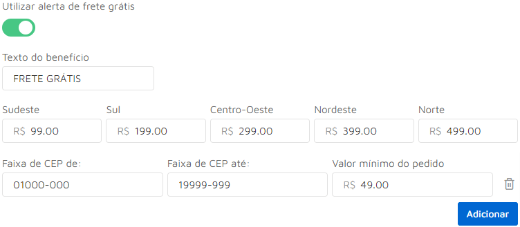 O alerta de frete grátis avançado consegue reproduzir toda a configuração de frete feita na plataforma. O cliente coloca o CEP no carrinho, e é mostrado quanto falta para que ele ganha frete grátis. Além de valores individuais para cada região, você pode colocar até 3 faixas de CEP personalizadas.